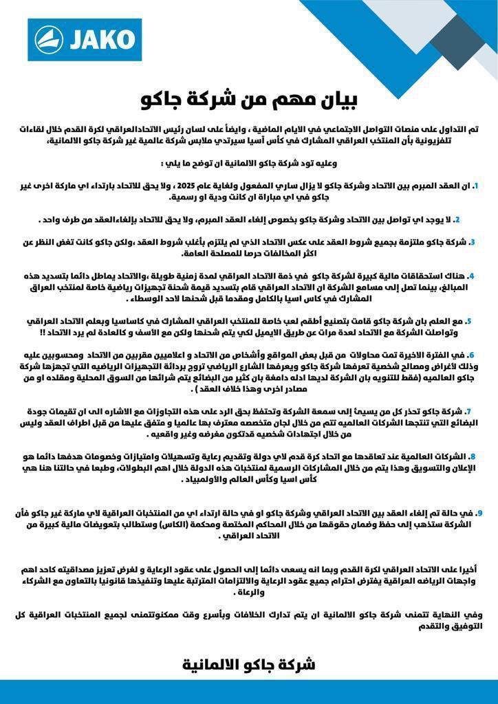 وقالت الشركة، في بيان تلقته وكالة اسرار الإخبارية (سنا)، انه “تم التداول على منصات التواصل الاجتماعي في الايام الماضية، وايضاً على لسان رئيس الاتحاد العراقي لكرة القدم خلال لقاءات تلفزيونية بأن المنتخب العراقي المشارك في كأس آسيا سيرتدي ملابس شركة عالمية غير شركة جاكو الالمانية، وعليه تود شركة جاكو الالمانية ان توضح ما يلي”.