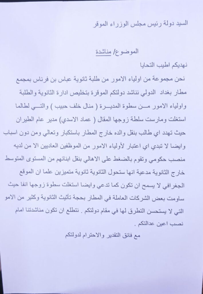 نحن مجموعة من اولياء الأمور من طلبة ثانوية عباس بن فرناس بمجمع مطار بغداد الدولي نناشد دولتكم الموقرة بتخليص ادارة الثانوية والطلبة واولياء الأمور من سطوة المديرة (منال خلف حبيب ) والتي لطالما استغلت ومارست سلطة زوجها المقال عماد الاسدي مدير عام الطيران حيث تهدد اي طالب بنقل والده خارج المطار باستكبار وتعالي ومن دون اسباب وايضا لا تبدي اي اعتبار لأولياء الأمور من الموظفين العاديين الا من لديه منصب حكومي وتقوم بالضغط على الاهالي بنقل ابنائهم من المستوى المتوسط خارج الثانوية مدعية انها ستحول الثانوية إلى ثانوية متميزين، علما ان الموقع الجغرافي لا يسمح ان تكون كما تدعي وايضا استغلت سطوة زوجها انفا حيث ساومت بعض الشركات العاملة في المطار بحجة تأثيث الثانوية وكثير من الأمور التي لا يستحسن التطرق لها في مقام دولتكم . نتطلع ان تكون مناشدتنا امام