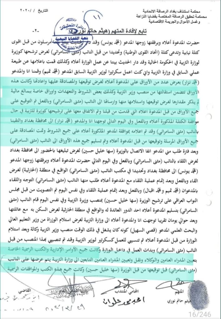 وأشار نوري إلى أنه “بعد استلامها الوزارة، تم تنصيبه كسكرتير لها بتوصية من النائب السامرائي، وأنه كان يقوم بعرض جميع الأوامر الإدارية والكتب الرسمية الخاصة بتعيين المدراء العامين والوكلاء ونقل وتعيين المدراء العامين التابعين للوزارة على النائب السامرائي قبل توقيعها من قبل الوزيرة”.