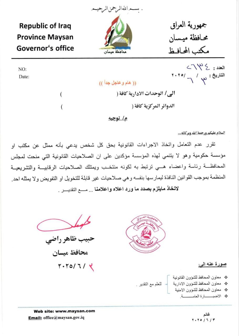 أصدر محافظ ميسان الأستاذ حبيب ظاهر توجيهاً رسمياً إلى جميع الوحدات الإدارية والدوائر المركزية في المحافظة، شدد فيه على عدم التعامل مع أي شخص يدّعي تمثيل جهة أو مؤسسة حكومية ما لم يكن منتسباً رسمياً لها.