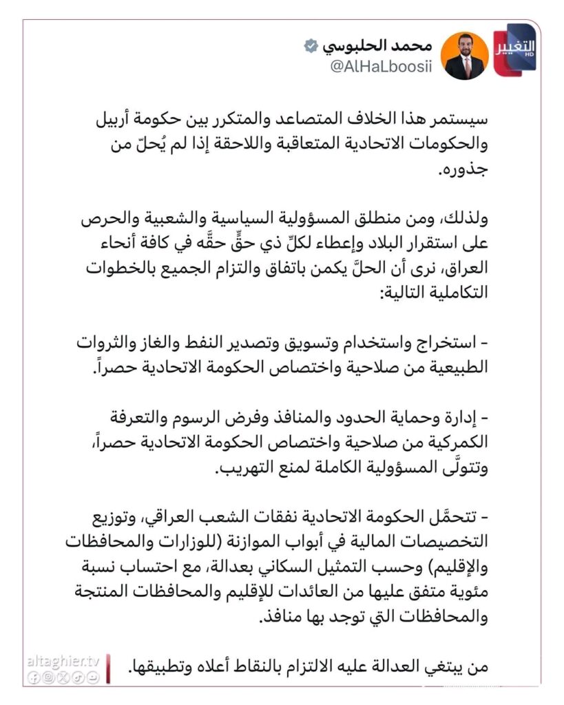 سیستمر هذا الخلاف المتصاعد والمتکرر بین حكومة أربيل والحكومات الاتحادية المتعاقبة واللاحقة إذا لم يُحل من جذوره. ولذلك، ومن منطلق المسؤولية السياسية والشعبية والحرص على استقرار البلاد وإعطاء ل ذي حق حقه في كافة أنحاء العاق، نرى أن الحل يكمن باتفاق والتزام الجميع بالخطوات التكاملية التالية: استخراج واستخدام وتسويق وتصدير النفط والغاز والثروات الطبيعية من صلاحية واختصاص الحكومة الاتحادية حصرا. إدارة وحماية الحدود والمنافذ وفرض الرسوم والتعرفة الكمركية من صلاحية واختصاص الحكومة الاتحادية حصراً، وتتولى المسؤولية الكاملة لمنع التهريب. تتحمل الحكومة الاتحادية نفقات الشعب العراقي، وتوزيع التخصيصات المالية في أبواب الموازنة (للوزارات والمحافظات والإقليم) وحسب التمثيل السكاني بعدالة، مع احتساب نسبة مئوية متفق عليها من العائدات للإقليم والمحافظات المنتجة والمحافظات التي توجد بھا منافذ. من يبتغي العدالة عليه الالتزام بالنقاط أعلاه وتطبيقها.