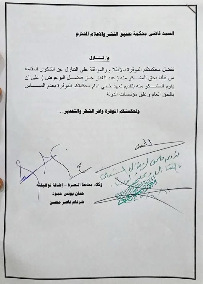 قدم وكلاء محافظ البصرة أسعد العيداني اليوم الأربعاء طلباً إلى المحكمة للتنازل عن الشكوى المقامة ضد مسؤول تنسيقية تظاهرات قضاء المدينة عبدالغفار جبار العوضي بشرط التعهد بعدم المساس بالحق العام وغلق مؤسسات الدولة.