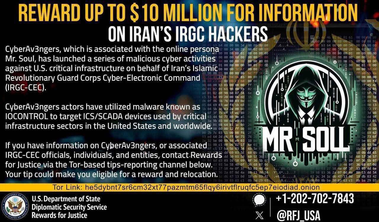 واشنطن تعلن رسمياً: مكافأة تصل إلى 10 مليون دولار لمن يُبلغ عن قراصنة إيرانيين يبدو أن أحد القراصنة الذي يطلق على نفسه اسم السيد سول تمكن من استعادة قدرة الإيرانيين على الوصول إلى دفاعاتهم المخترقة.ويبدو أن دفاعات البلاد تعرضت للاختراق، وتمكن هذا الشخص، باستخدام هذه الهوية، من استعادة القدرة الإيرانية على الوصول إلى الدفاعات، وتعطيل الاختراق، وتقديم نفسه على أنه السيد سول.وبعد أقل من ساعة من تفعيل الدفاعات، صدر بيان أمريكي عن هذا الشخص يعرض مكافأة قدرها 10 ملايين دولار لأي شخص يستطيع التعرف على السيد سول.