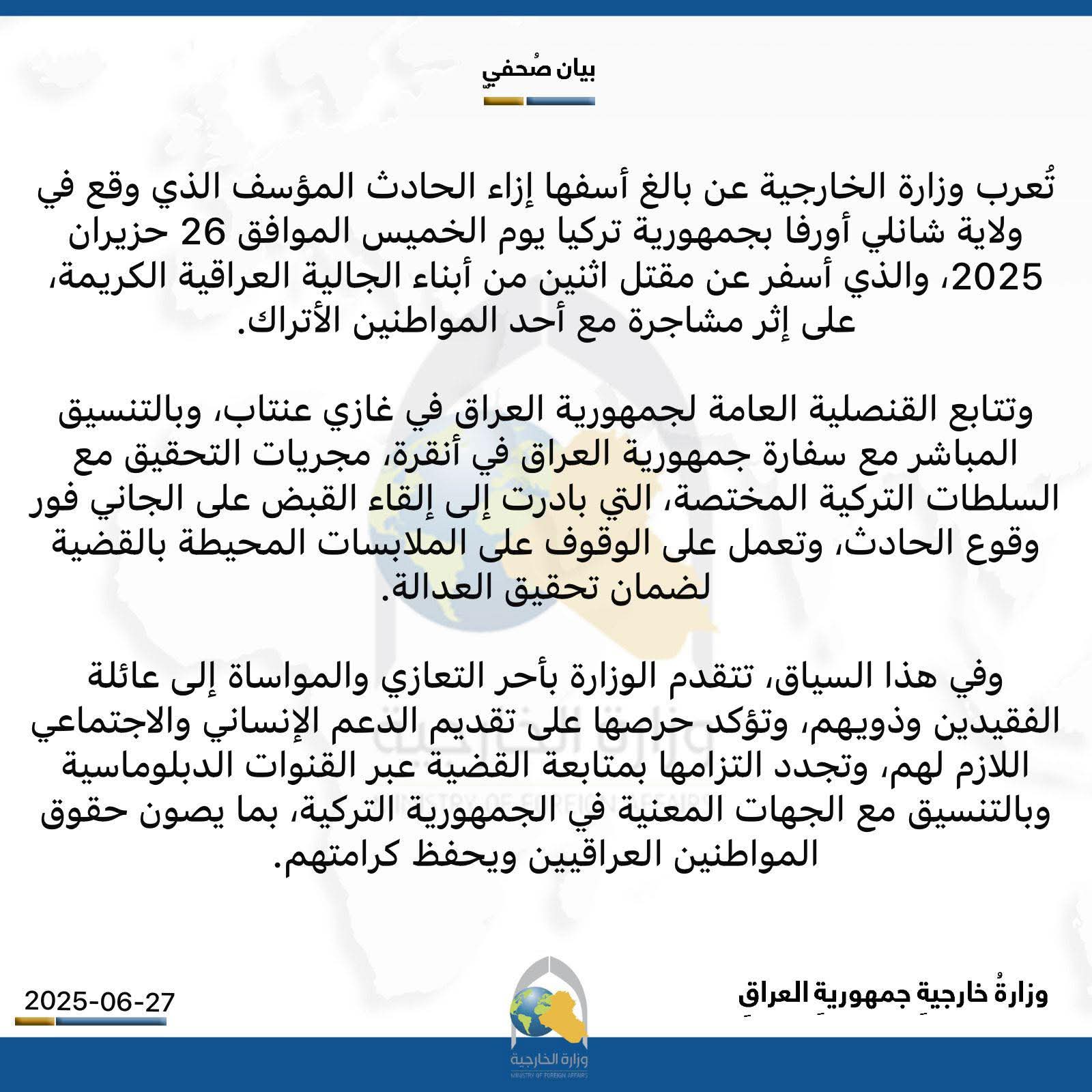 أعربت وزارة الخارجية العراقية عن بالغ أسفها واستنكارها للحادث الذي وقع في مدينة أورفا التركية، وأسفر عن مقتل اثنين من أبناء الموصل إثر مشاجرة مع أحد المواطنين الأتراك.