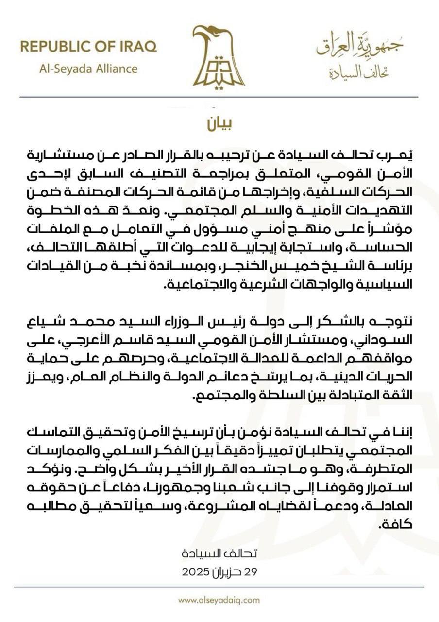 عاجل تحالف السيادة يعرب عن ترحيبه بالقرار الصادر عن مستشارية الأمن القومي، المتعلق بمراجعة التصنيف السابق لإحدى الحركات السلفية، وإخراجها من قائمة الحركات المصنفة ضمن التهديدات الأمنية والسلم المجتمعي