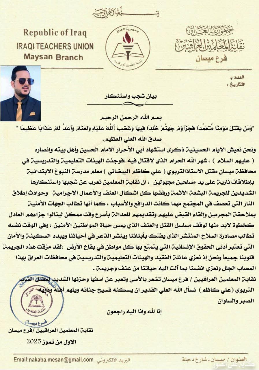 نقابة المعلمين في ميسان تعرب عن شجبها واستنكارها لجريمة مقتل احدالكوادر التدريسية بقضاء الكحلاء بمحافظة ميسان على يد مسلحين مجهولين .وتطالب بالقبض على المجرمين وتقديمهم للقضاء ومصادرة السلاح المنتشرالذي يفتك ويخلق الذعر والخوف عند المواطنين