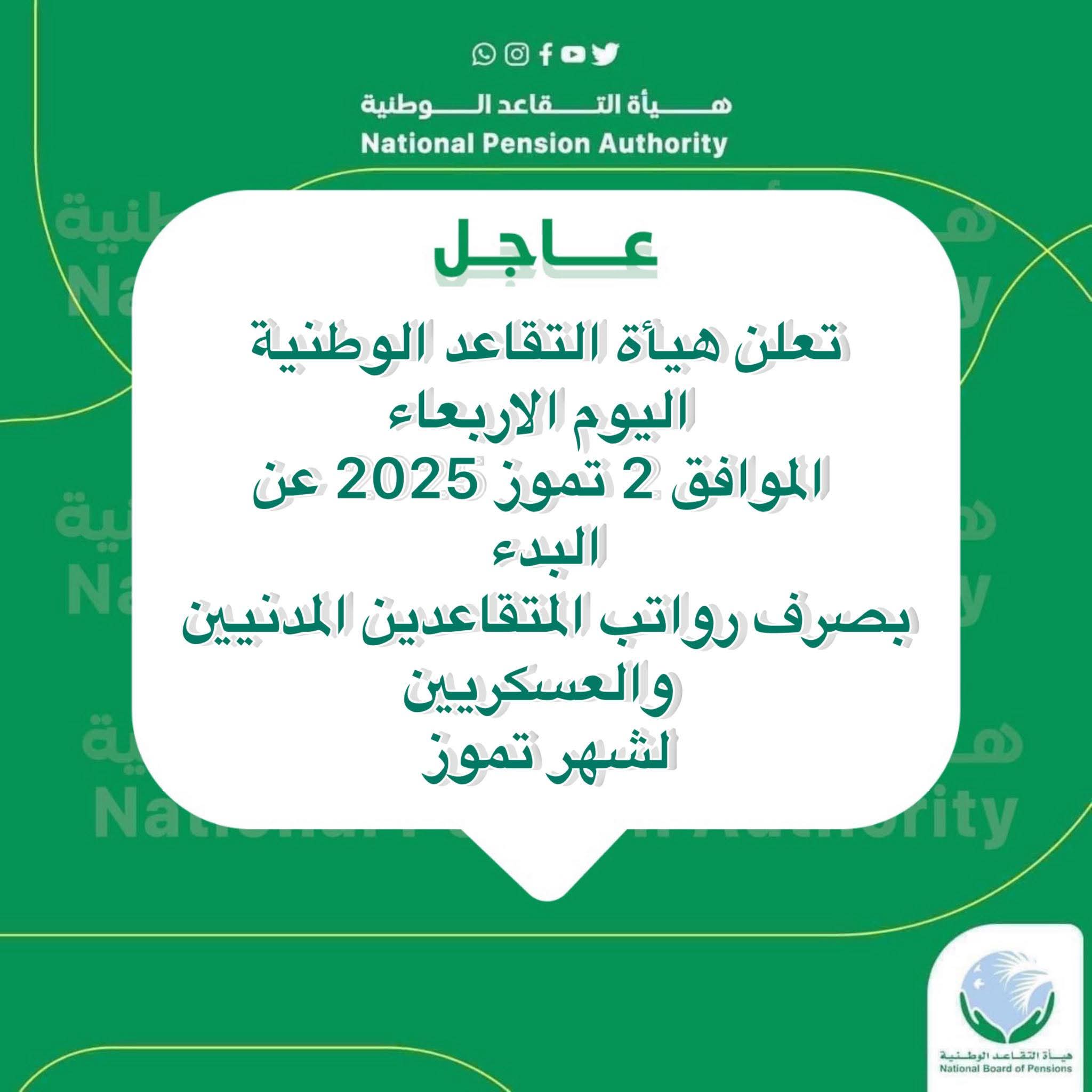 تَعلُن هيأة التقاعد الوطنية اليوم الاربعاء الموافق٢ تموز ٢٠٢٥ عن البدء بصرف رواتب المتقاعدين المدنيين والعسكريين لشهر تموز وبشكل تدريجيوتدعو الهيأة المتقاعدين كافة ممن تصلهم رسائل نصية مراجعة فروع المصارف ومنافذ الدفع الالكتروني في بغداد والمحافظات لاستلام رواتبهم هيأة التقاعد الوطنية