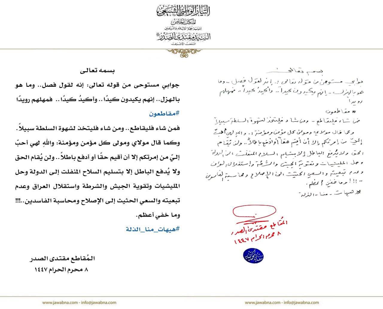 زعيم التيار الوطني الشيعي السيد مقتدى الصدر يجدد تأكيده على المقاطعة