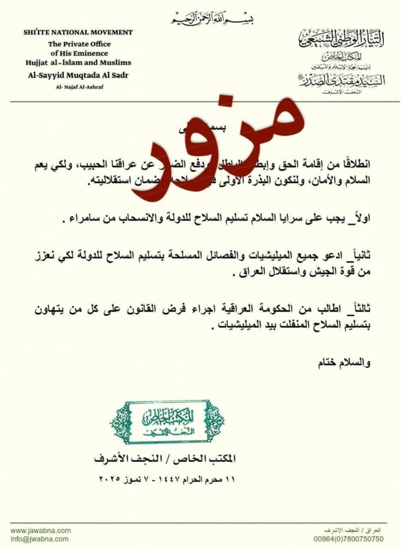 وأضاف “البيان الذي تم تداوله على أنه صادر من مكتب الخاص للصدر مفبرك ولا أساس له من الصحة”.
