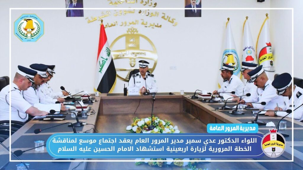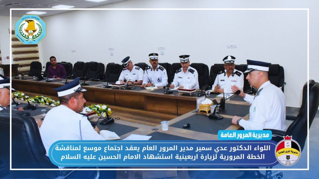 للواء الدكتور عدي سمير مدير المرور العام وبحضور مدراء المديريات والاقسام ،يعقد اجتماع موسع لمناقشة التحضيرات والاستعدادات لوضع الخطة المرورية لزيارة اربعينية استشهاد الامام الحسين عليه السلام ،وتأمين حركة السير والمرور لخط سير الزوار الكرام ومن جميع المحافظات صوب كربلاء المقدسة…………إعلام مديرية المرور العامة