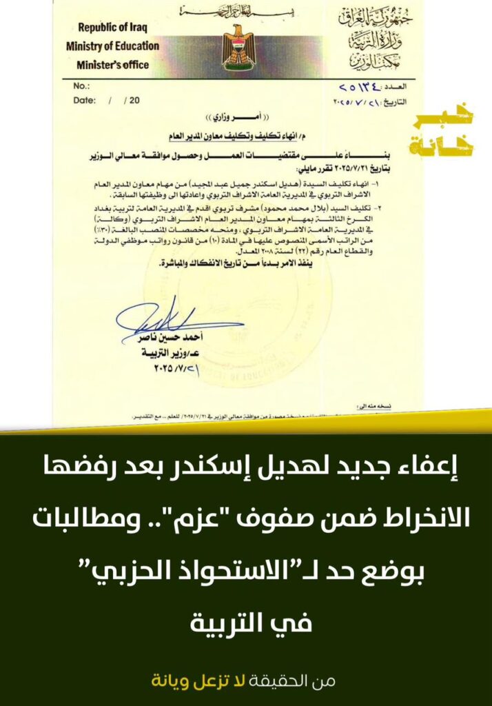 إعفاء جديد لهديل إسكندر بعد رفضها الانخراط ضمن صفوف “عزم”.. ومطالبات بوضع حد لـ”الاستحواذ الحزبي” في التربية