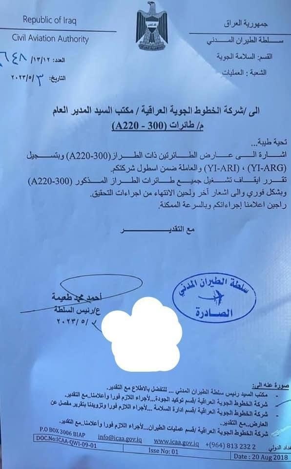 في أبريل 2023، أعلنت سلطة الطيران المدني عن تعرض طائرة A220 عراقية مسجلة تحت الرقم YI-ARI لأضرار في غطاء المحرك وكسور في زعانف المروحة أثناء الهبوط في مطار بغداد.