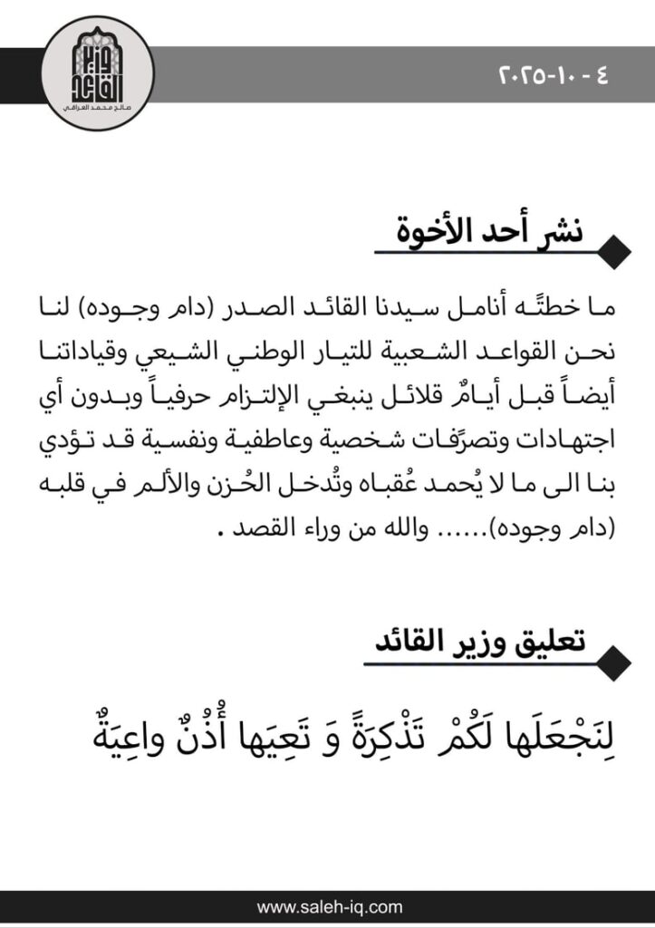 علق صالح محمد العراقي، المعروف بـ “وزير الصدر”، السبت، على أحد أتباع التيار الذي أكد ضرورة التزام القواعد الشعبية والقيادات بالتوجيهات الأخيرة لزعيم التيار مقتدى الصدر، بإيقاف التظاهرات السلمية لأنصاره أو المظاهر المسلحة لسرايا السلام، والاكتفاء بالرد عبر مواقع التواصل الاجتماعي على أي اعتداء يطاله بالكلام.