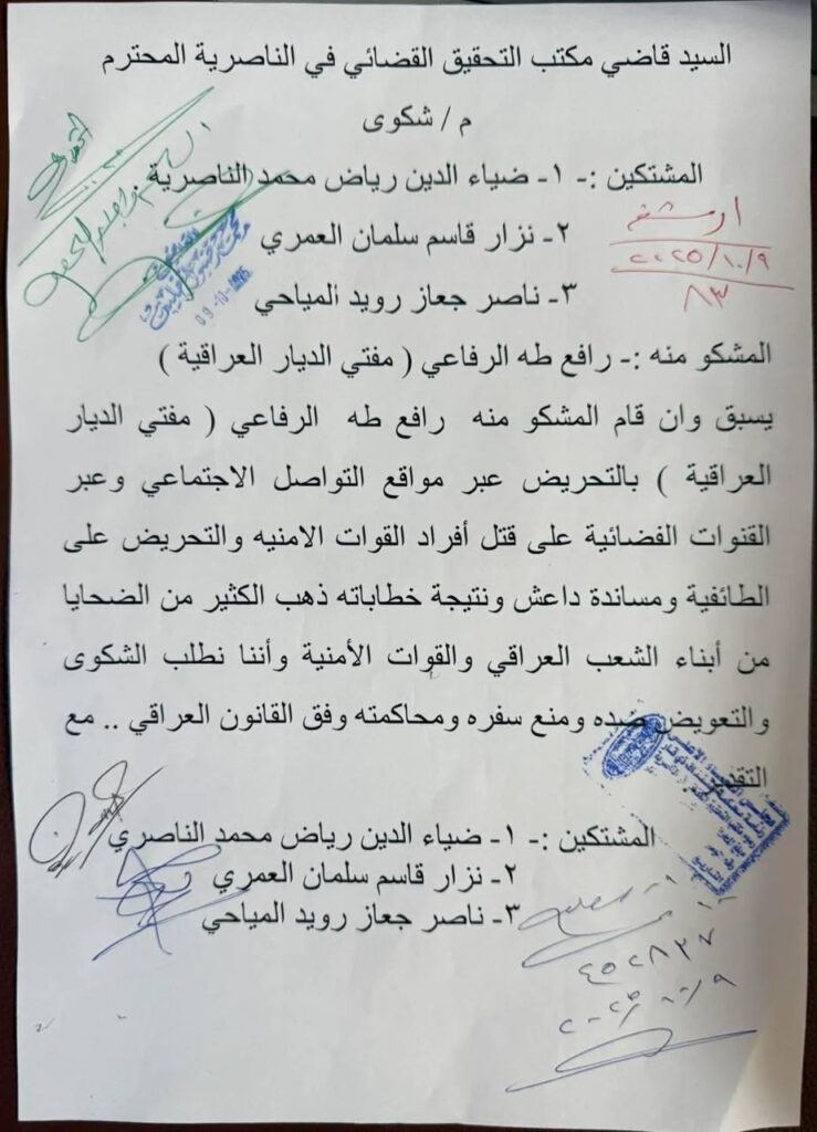 ( بوثيقة) دعوى قضائية ضد رافع الرفاعي بتهم التحريض على العنف والطائفية بعد عودته إلى بغداد