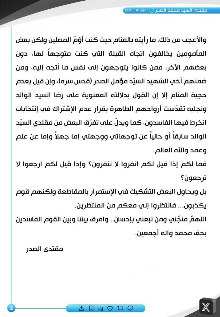 الصدر يجدد موقفه من عدم المشاركة بالانتخابات: البعض يحاول التشكيك بالاستمرار بالمقاطعة ولكنهم قوم يكذبون