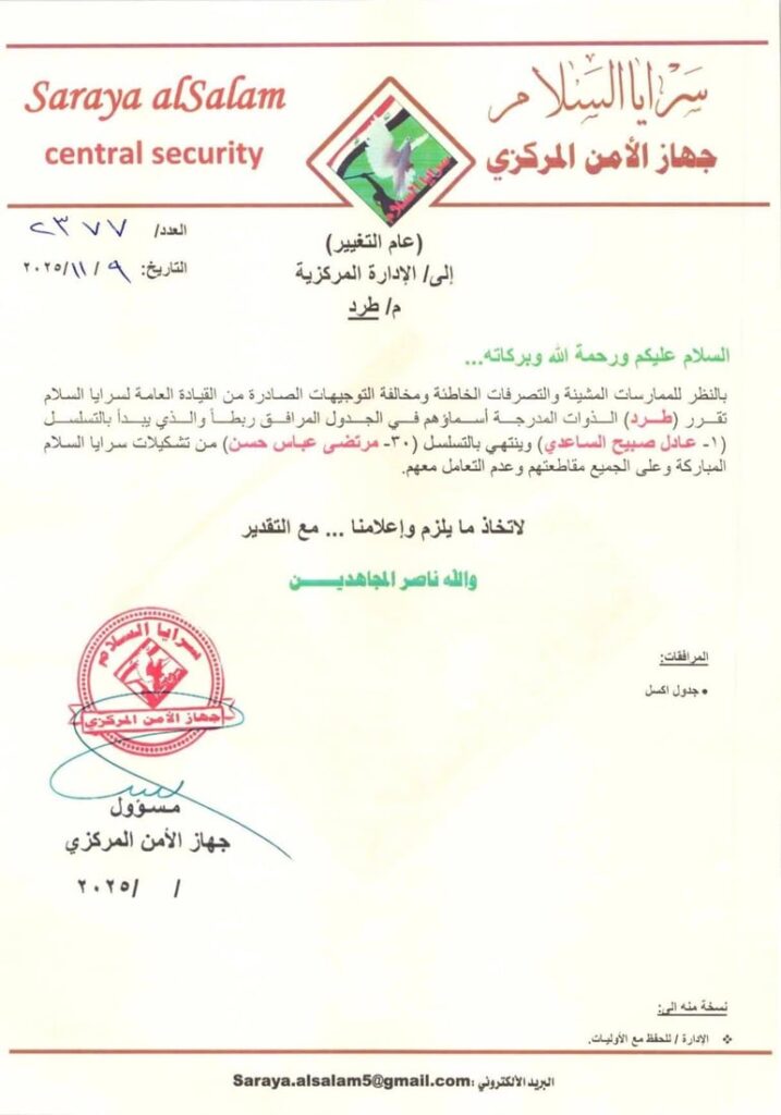 أعلن جهاز الأمن المركزي في سرايا السلام/ الجناح المسلح للتيار الصدري، طرد 30 منتسباً من صفوفه في محافظات بغداد والبصرة وبابل وذي قار وديالى وصلاح الدين والقادسية، موجهاً بمقاطعتهم وعدم التعامل معهم مطلقاً.