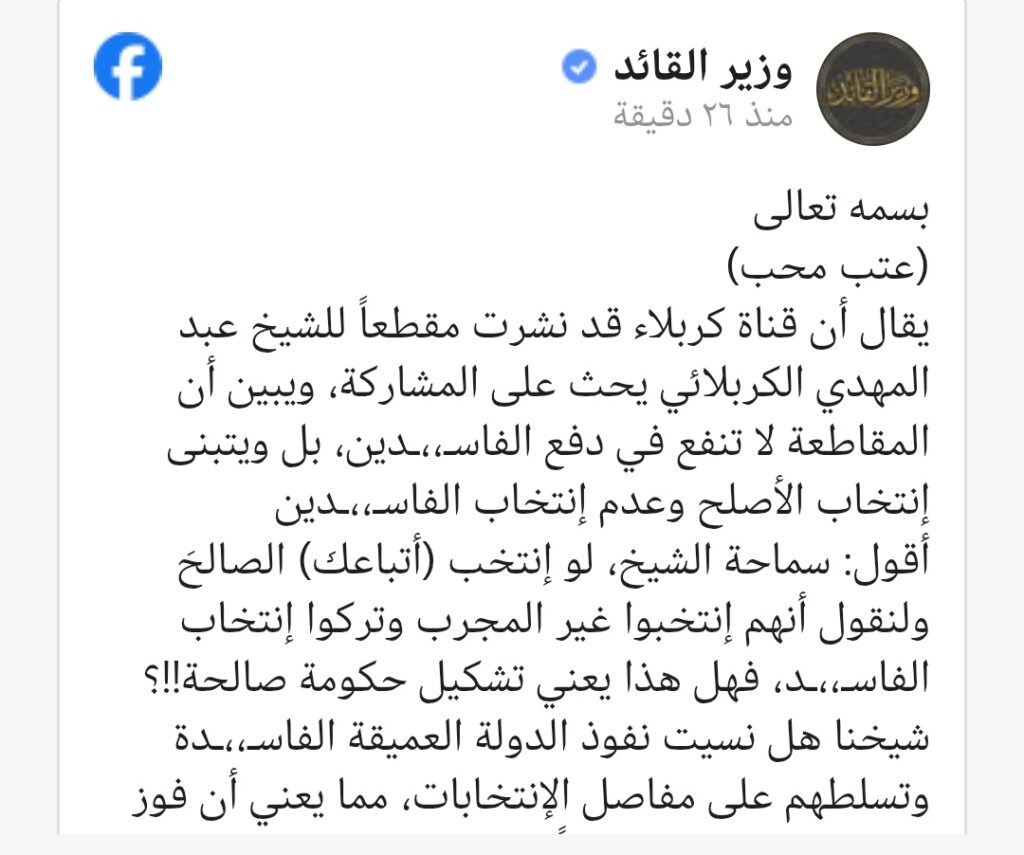 وقال “صالح محمد العراقي”، “في منشور له بعنوان (عتب محب)، إن قناة كربلاء بثّت مقطعاً للكربلائي يحث فيه على المشاركة بالانتخابات، ويبيّن أن المقاطعة لا تنفع في ردع الفاسدين، داعياً إلى انتخاب الأصلح وعدم التصويت للفاسدين.