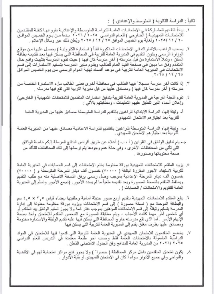 * يُسمح لمن مضى على انهائه المرحلة الابتدائية ثلاث سنوات أو أكثر التقديم لاداء الامتحانات الخارجية للدراسة المتوسطة، على ان يكون عمر المتقدم دون (28) عاما، اما من اكمل (28) فما فوق بإمكانه أداء الامتحانات مباشرة دون سنوات الانتظار اعلاه. ويقبل الراغب باداء الامتحانات التمهيدية للدراسة الإعدادية في حال انهائه المرحلة المتوسطة أو ما يعادلها بنجاح.