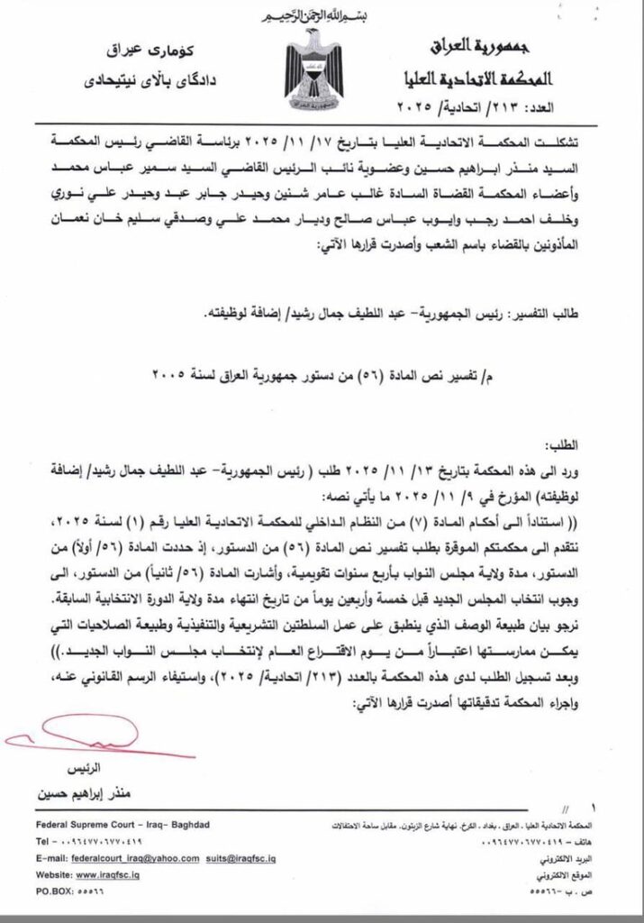 أنهت المحكمة الاتحادية، اليوم الاثنين، عمل البرلمان وحددت الحكومة بتصريف الأعمال فقط، فيما أكدت على استمرار رئيس الجمهورية بمهامه، بتفسير المادة 56 من الدستور، استجابة لطلب من رئيس الجمهورية عبد اللطيف رشيد.