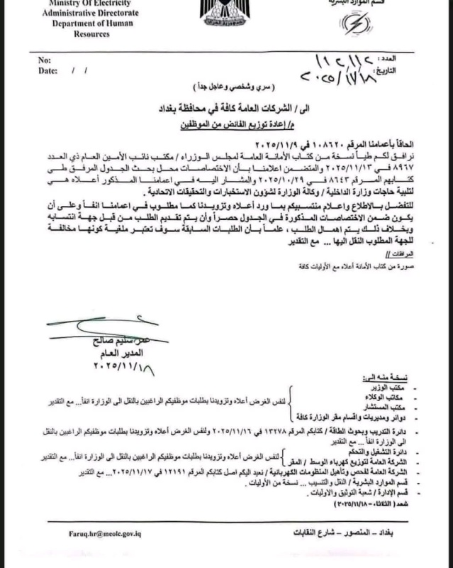 اظهرت وثيقة صادرة عن وزارة الكهرباء، توجيه بتوزيع عدد من موظفيها الفائضين على تشكيلات وزارة الداخلية.
