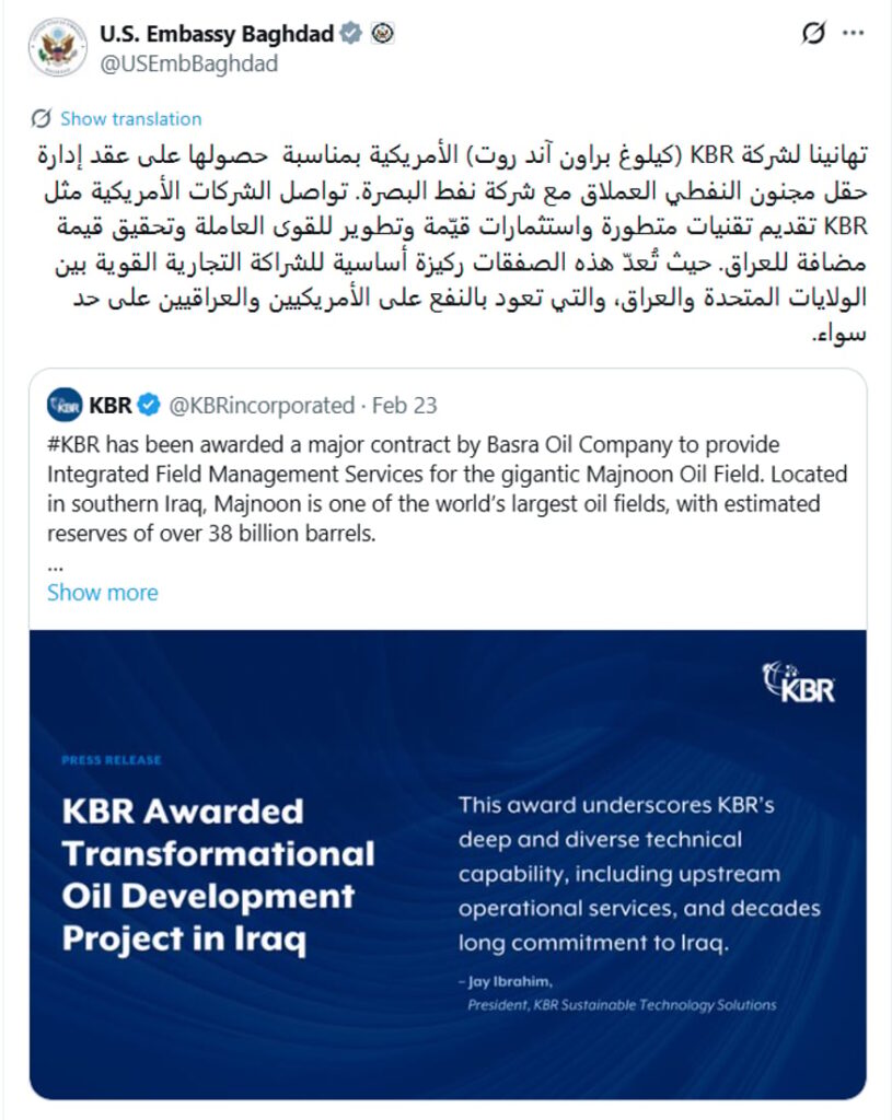 وذكرت السفارة في تدوينة، تابعتها وكالة سنا الاخبارية، اليوم الأربعاء (25 شباط 2026)، “تهانينا لشركة KBR (كيلوغ براون آند روت) الأمريكية بمناسبة حصولها على عقد إدارة حقل مجنون النفطي العملاق مع شركة نفط البصرة”.