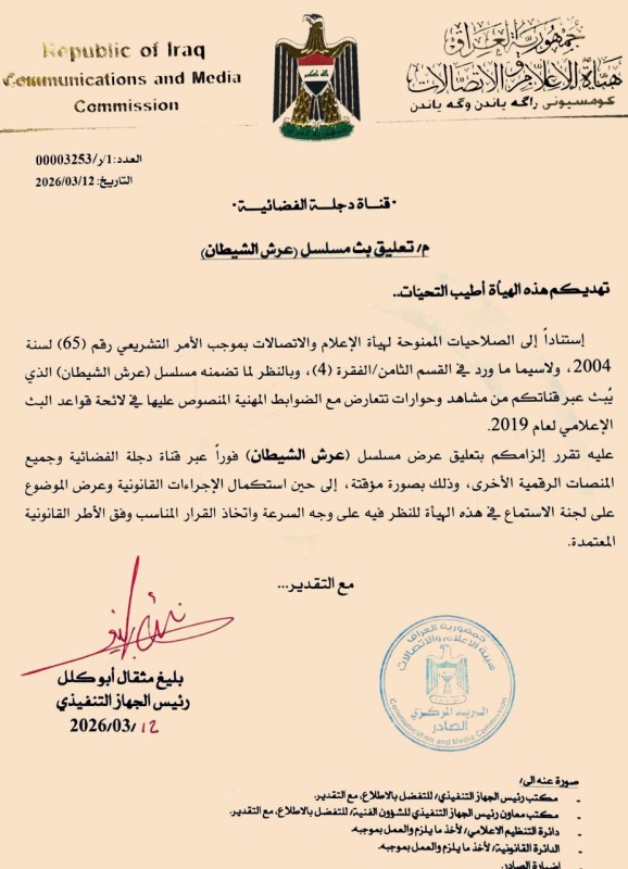 واشارت وثيقة صادرة من الهيئة وحصلت عليها “وكالة سنا الاخبارية “، الى قرار “تعليق عرض مسلسل فوراً عبر قناة دجلة الفضائية وجميع المنصات الرقمية الأخرى، وذلك بصورة مؤقتة، إلى حين استكمال الإجراءات القانونية وعرض الموضوع على لجنة الاستماع في هذه الهيئة للنظر فيه على وجه السرعة واتخاذ القرار المناسب وفق الأطر القانونية المعتمدة”.