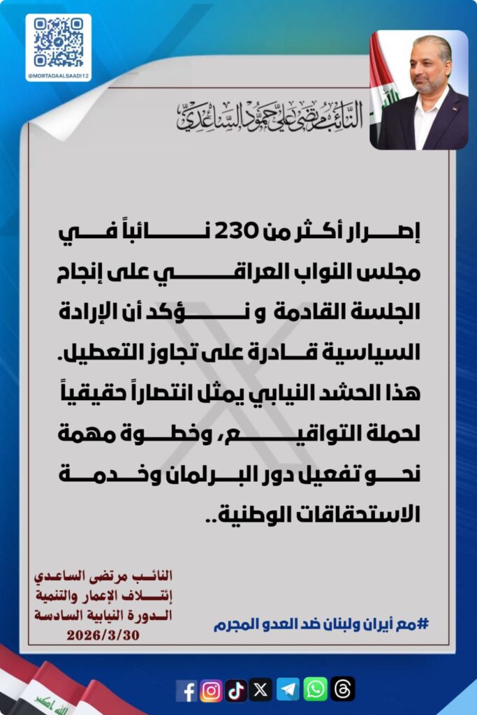وأوضح الساعدي أن هذا العدد يشكل مؤشراً واضحاً على وجود إرادة نيابية جادة للمضي قدماً في عقد الجلسة، مشيراً إلى أن حملة التواقيع حققت تقدماً ملموساً خلال الفترة الماضية.
