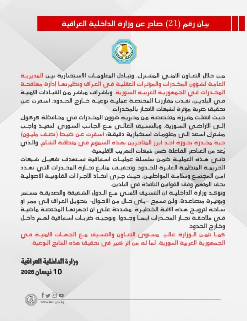 وذكرت الداخلية في بيان تلقته “وكالة سنا الاخبارية”، أن “مفرزة مختصة من مديرية شؤون المخدرات في محافظة كركوك انتقلت إلى الأراضي السورية بناءً على معلومات استخبارية دقيقة، حيث نجحت في تفكيك شبكة جرمية عابرة للحدود ضمن حملة تهدف لتجفيف منابع التجارة التي تهدد أمن المجتمع”.